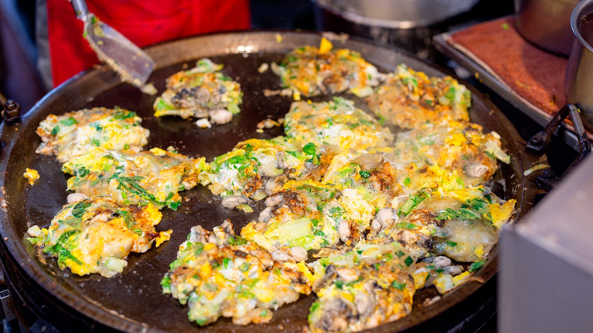 Oyster omelet, or o-a-chien, sits on a griddle in a Taiwanese night market.