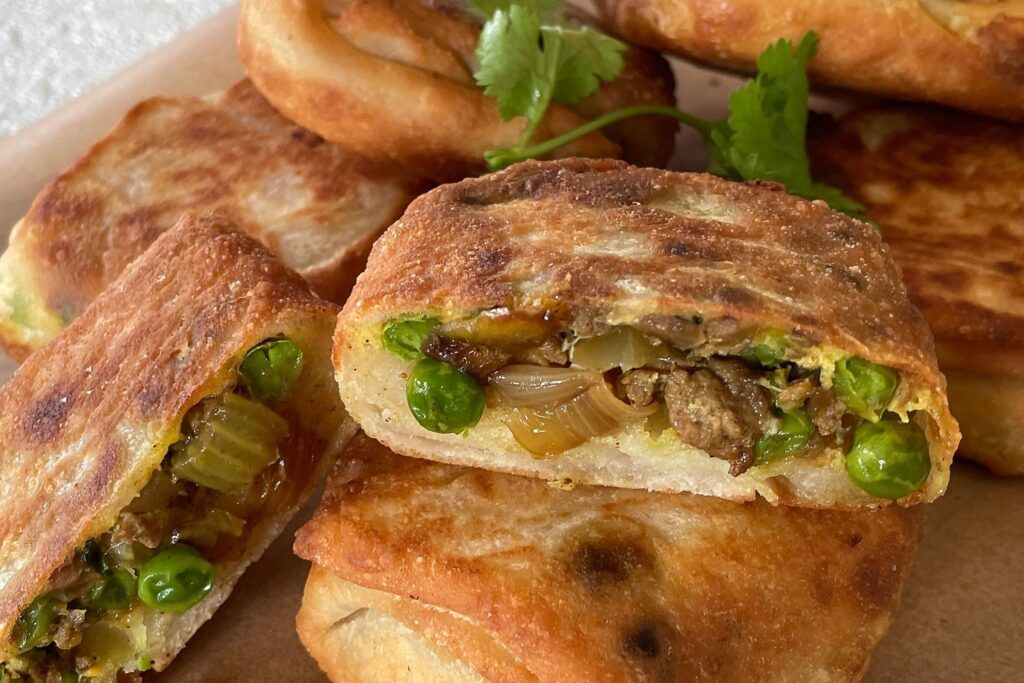 スパイスで味付けした挽肉と玉ねぎを、小麦粉の生地で包んで揚げ焼きにしたもの。