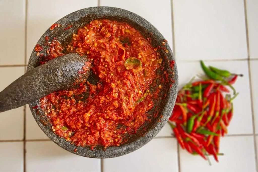 石臼(Batu Lesung)で叩き潰すと、唐辛子の細胞壁が壊れる。