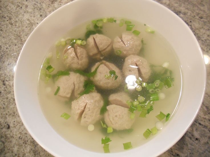 透明な豚骨スープに、灰色がかった豚肉団子が浮く。