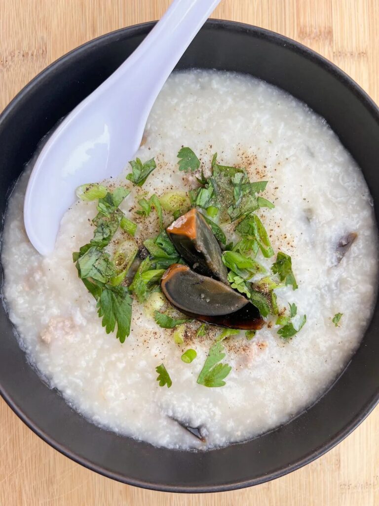 米の形が完全に消えるまで煮崩し、ピータンや豚肉、油條を浮かべる。